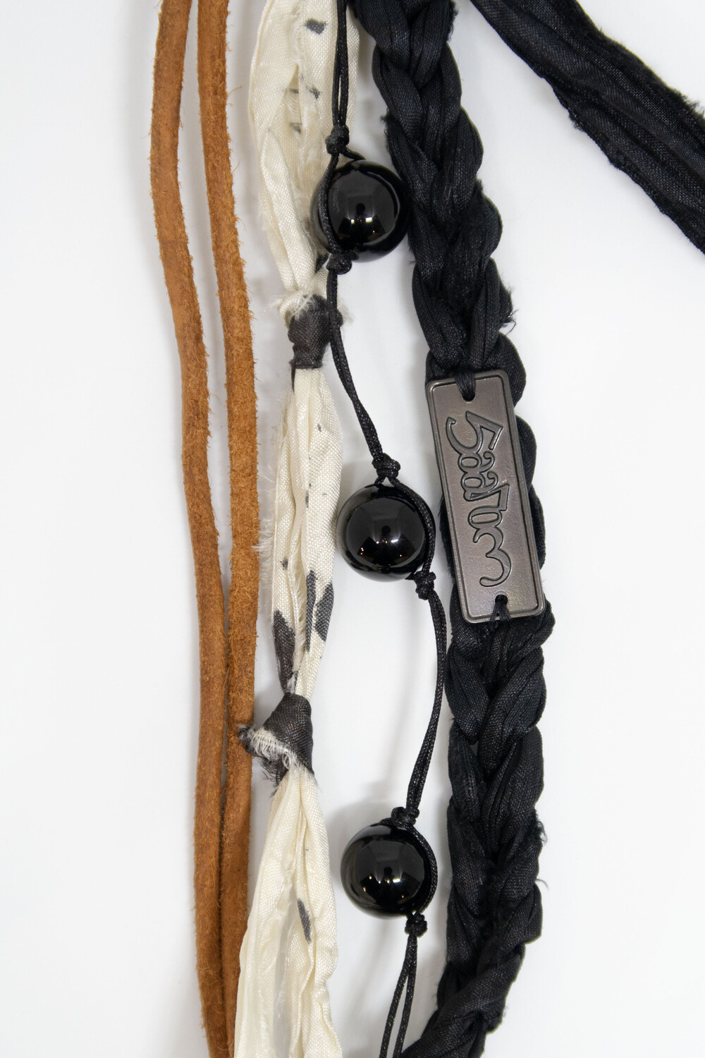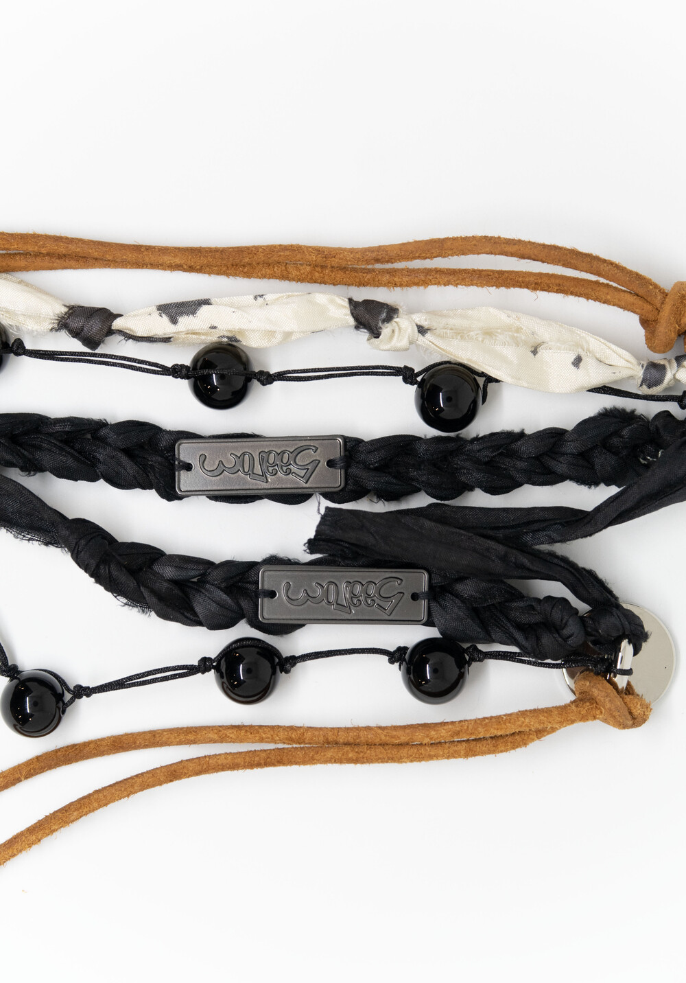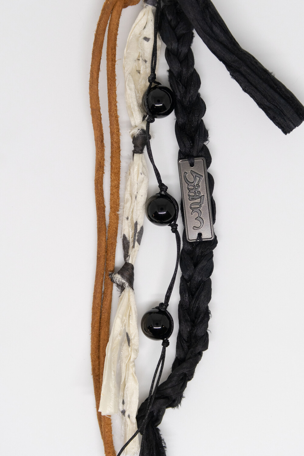 천연 스웨이드 소가죽을 두 갈래로 길게 늘어뜨리고, 손으로 땋은 실크 갈래에 메탈 소재의 로고를 부착하였습니다.