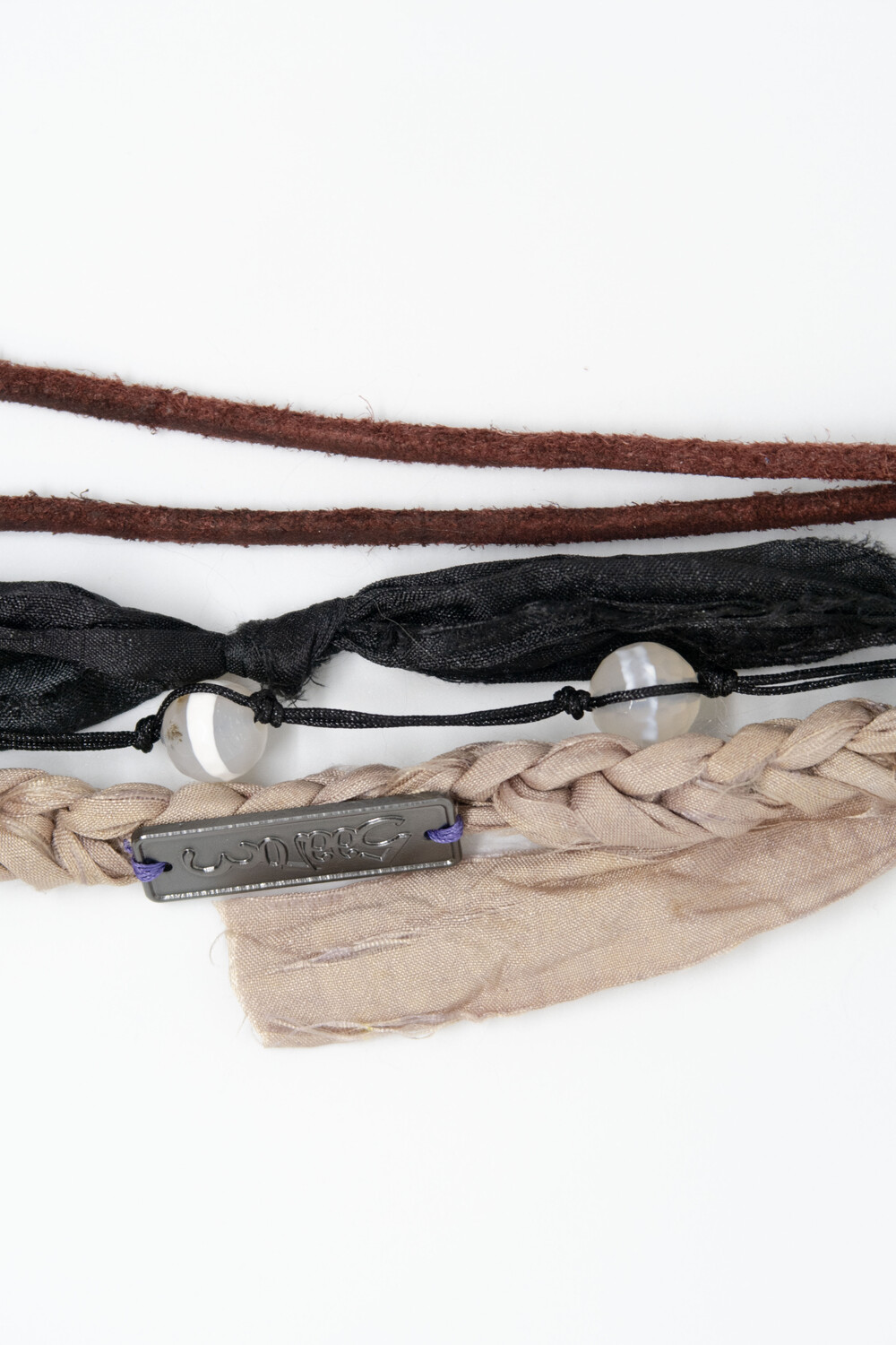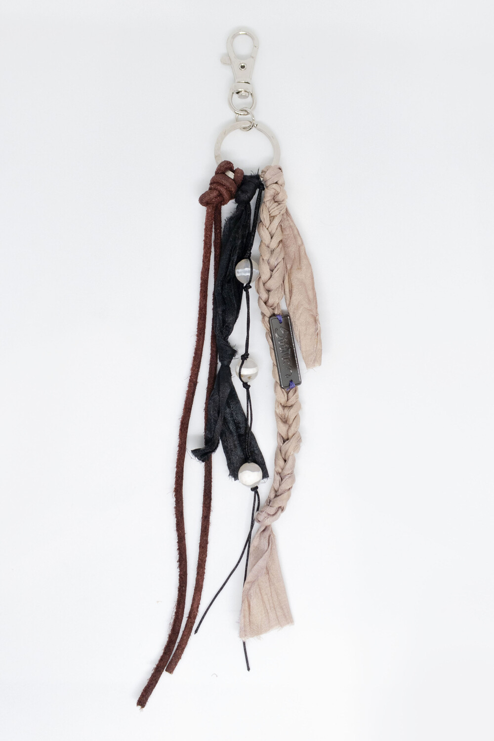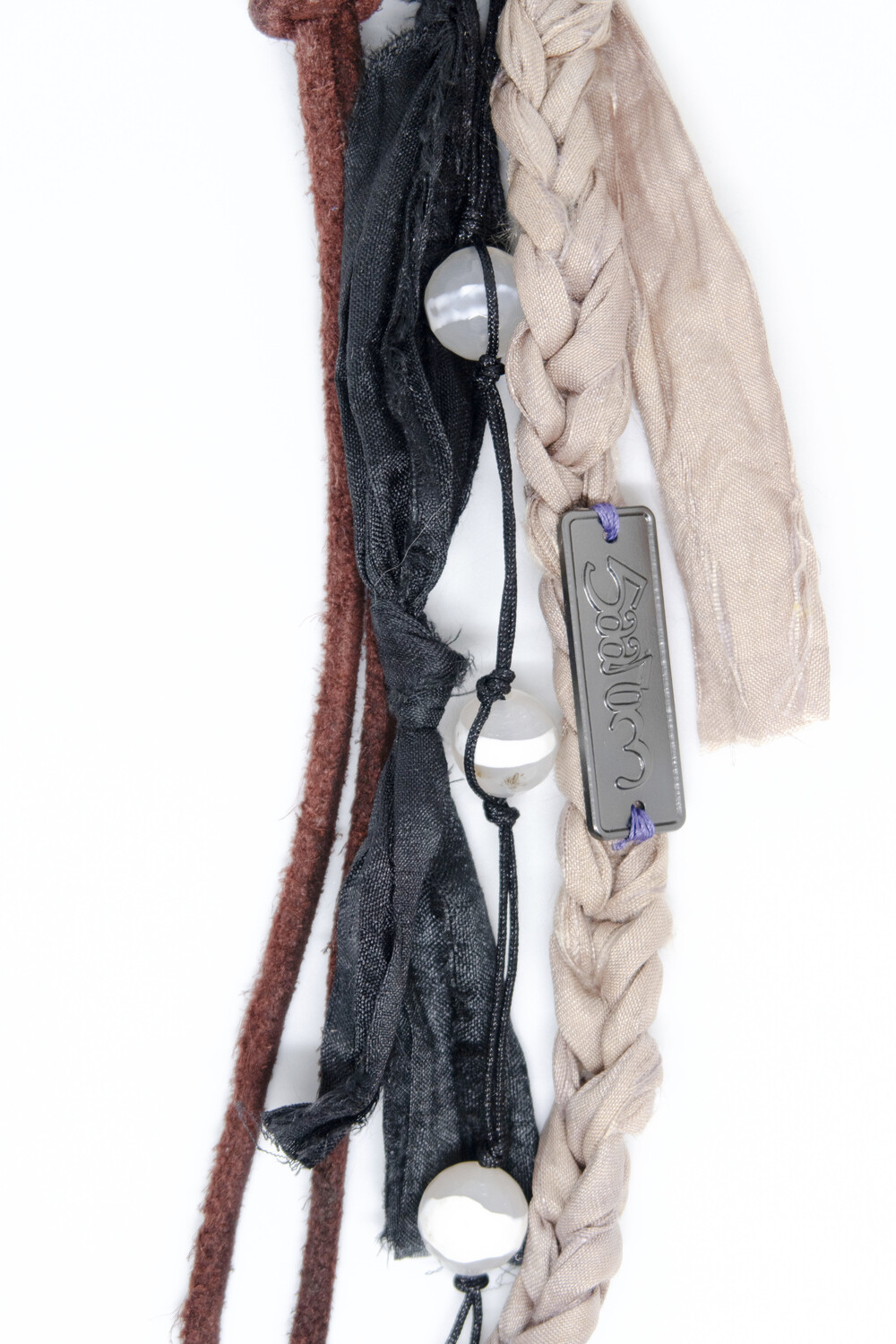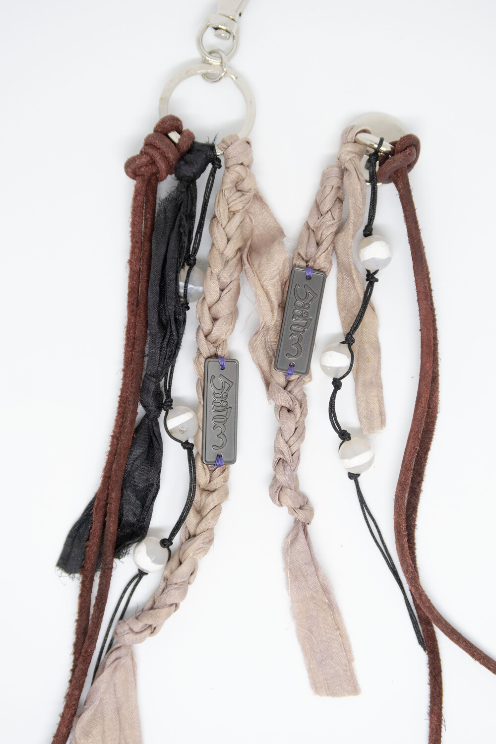 천연 스웨이드 소가죽을 두 갈래로 길게 늘어뜨리고, 손으로 땋은 실크 갈래에 메탈 소재의 로고를 부착하였습니다.