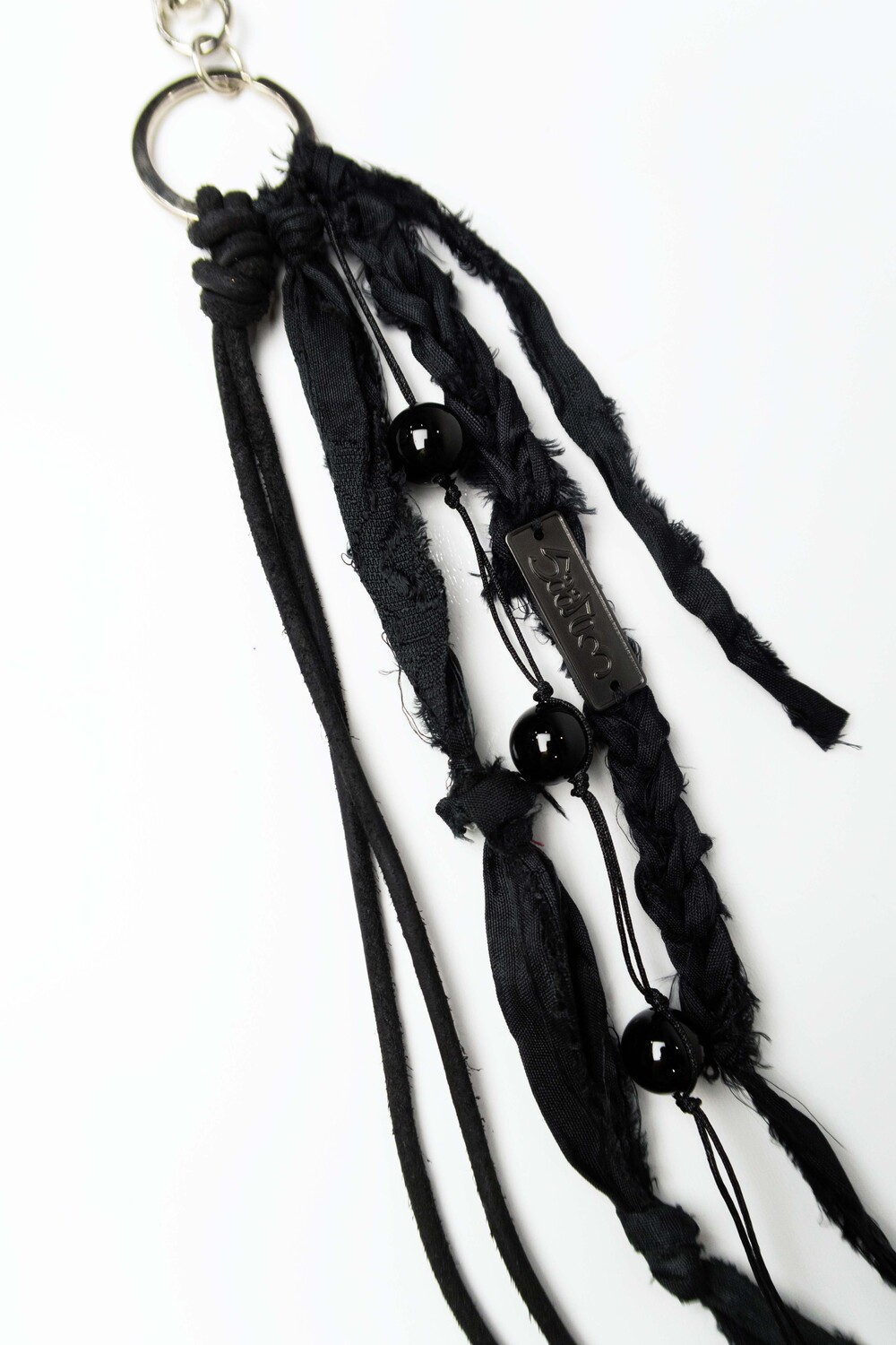 천연 스웨이드 소가죽을 두 갈래로 길게 늘어뜨리고, 손으로 땋은 실크 갈래에 메탈 소재의 로고를 부착하였습니다.