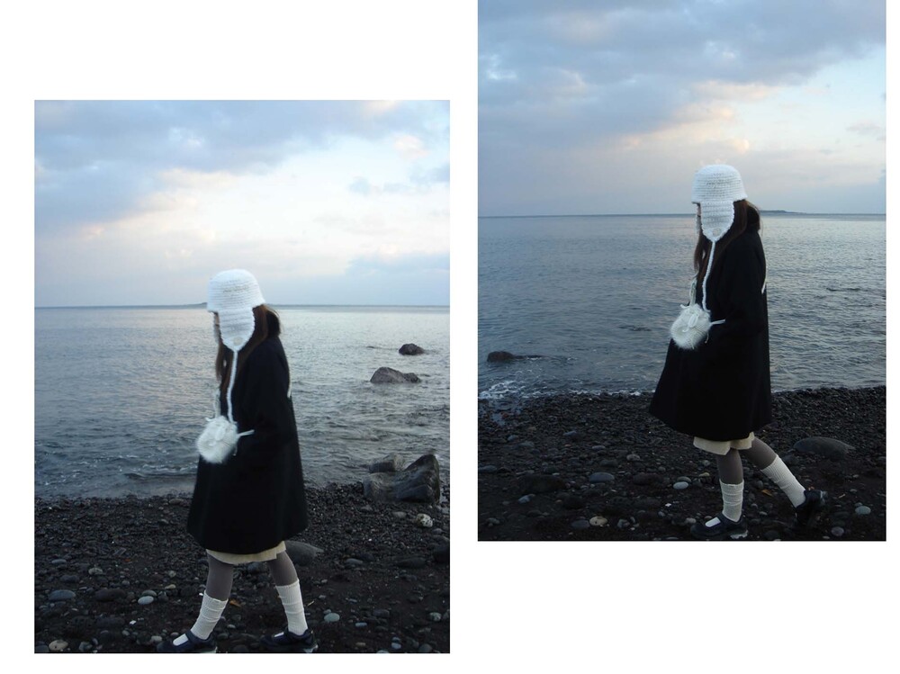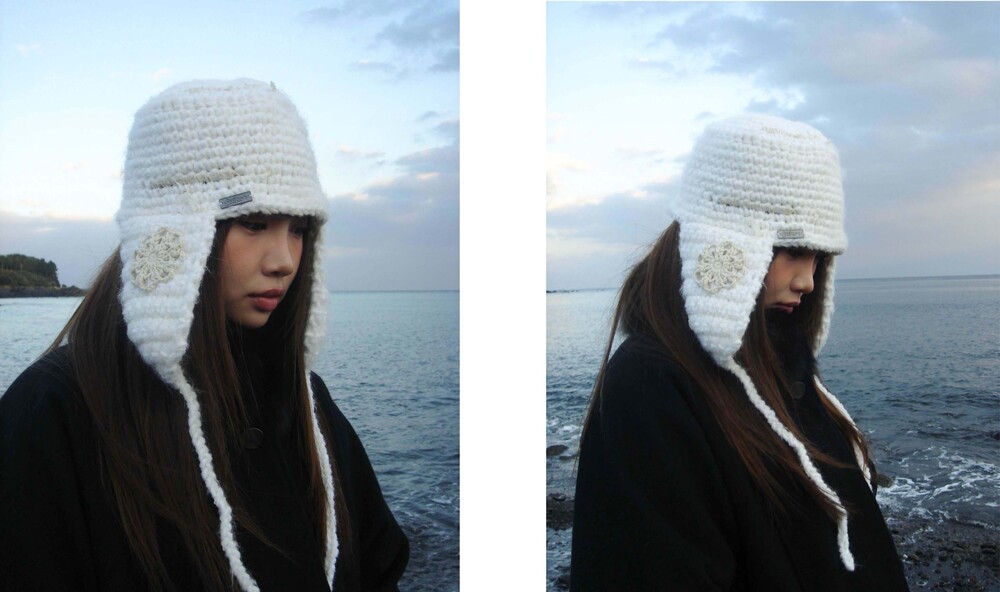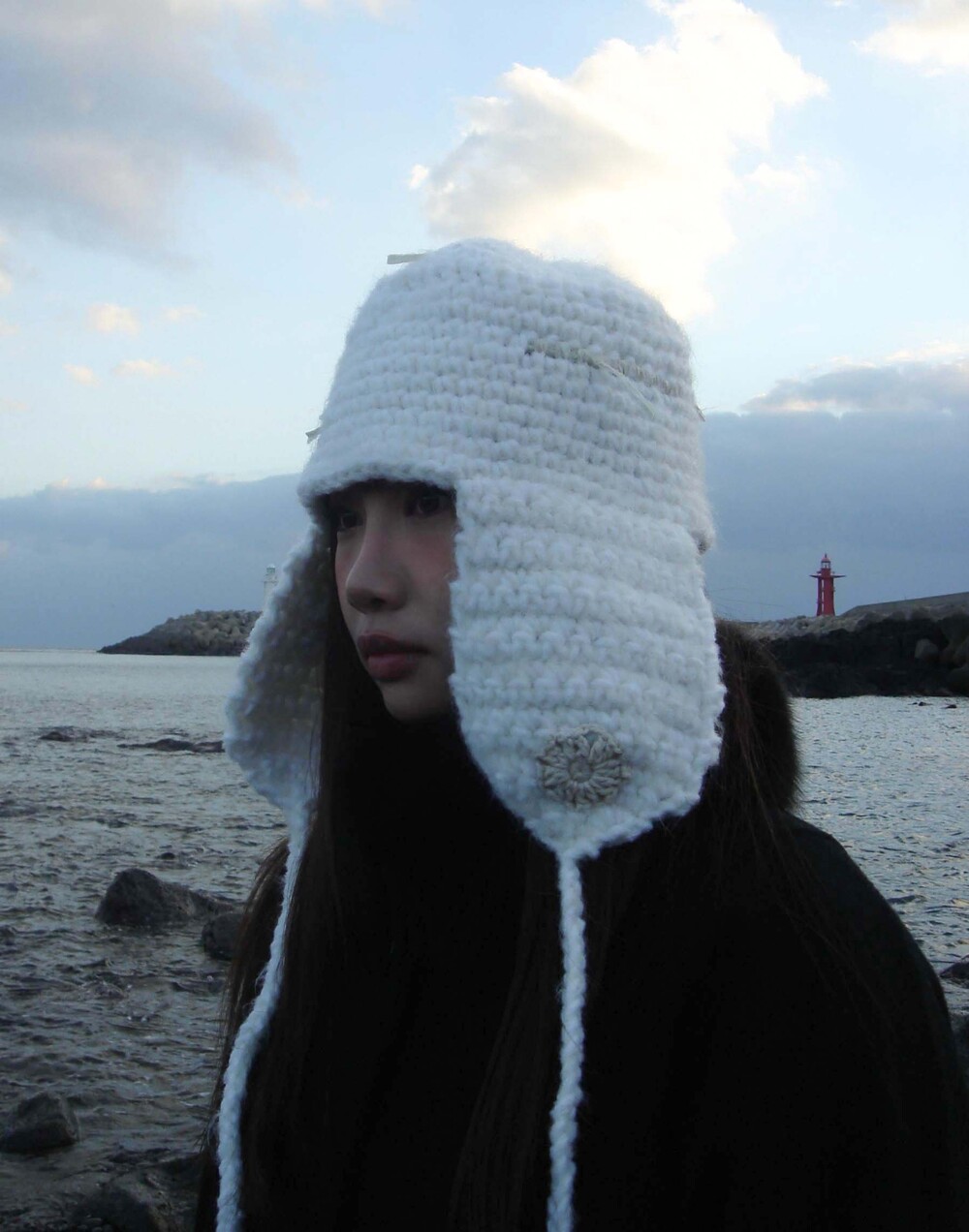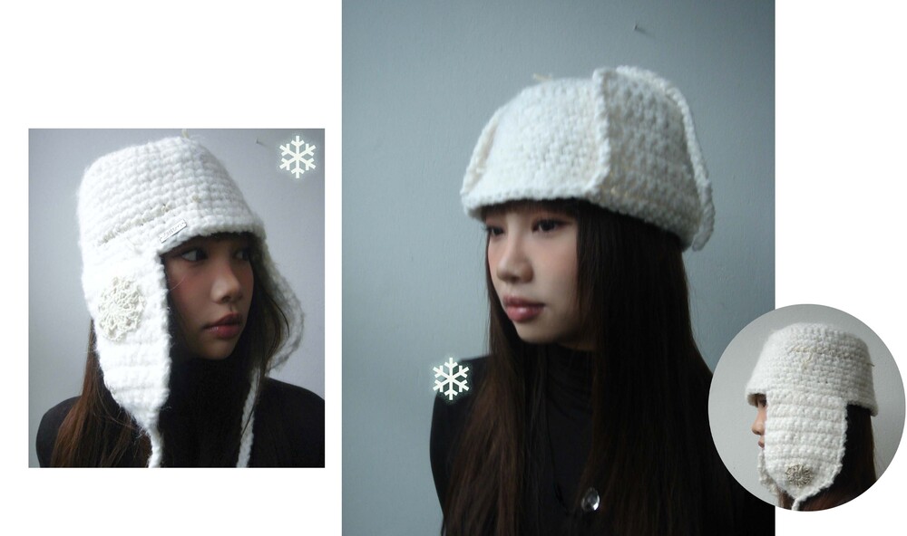 - 각이 진 푸딩 모양의 헤드 부분 포인트 - 실크와 함께 수놓은 디자인 - 눈 결정 모티브 패치 - 넓은 사이즈의 이어 플랩으로 보온성 제공