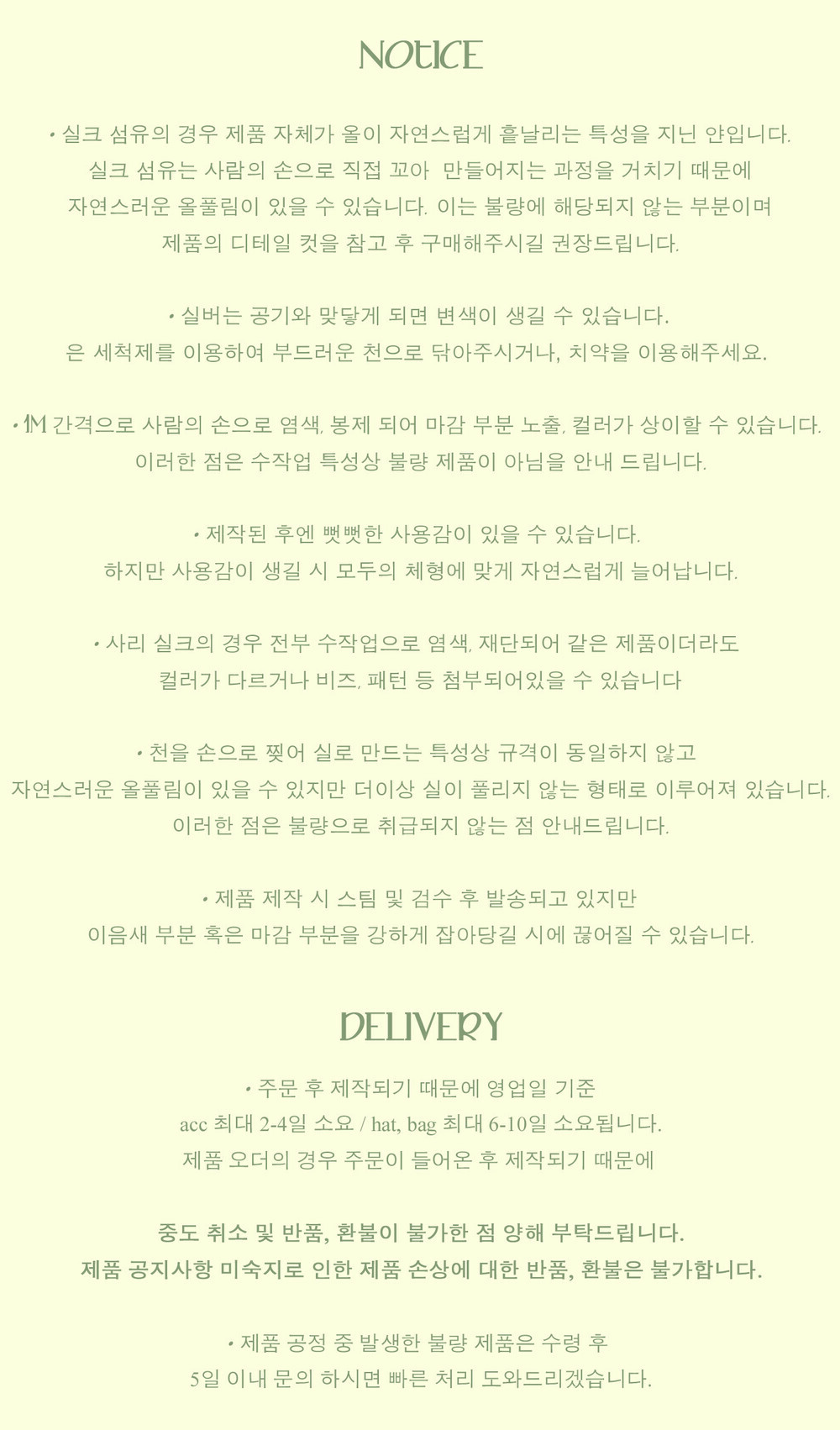 * 매듭 포인트 부분은 양쪽 끝이 러프하게 노출되어있습니다. 물에 닿아도 가능하지만, 실이 풀려 튀어나올 수 있습니다. 마감 부분을 강하게 잡아당길 시에 끊어지거나 풀릴 수 있어 끝부분만 잘라주시길 바랍니다. 풀린 경우로 인한 교환 및 환불은 불가합니다.