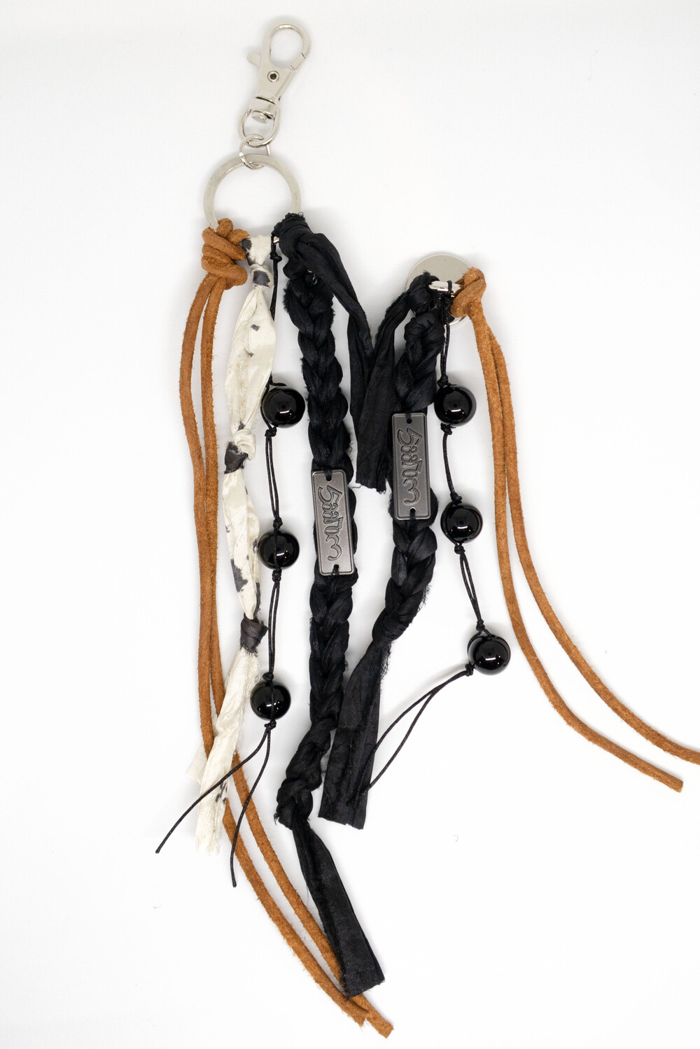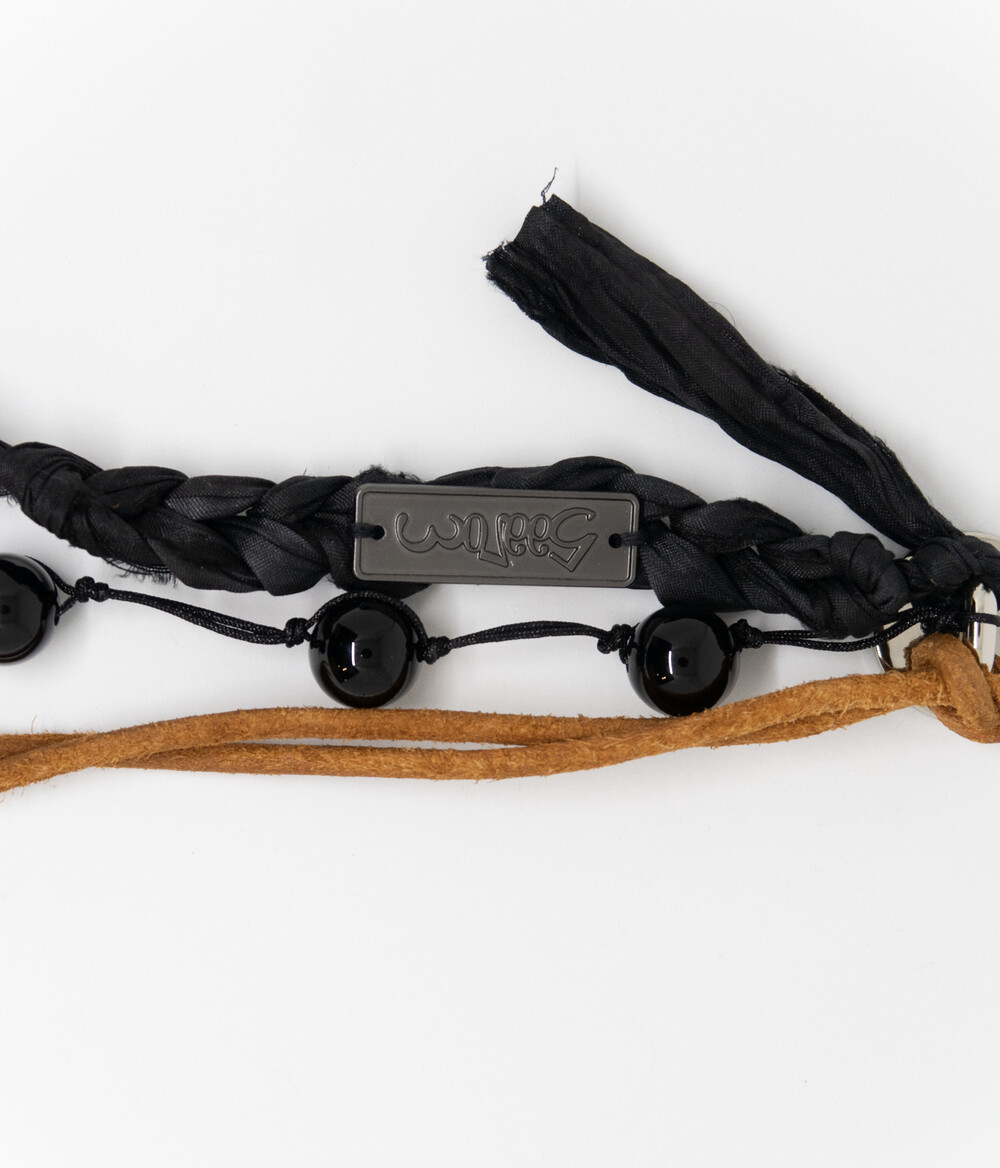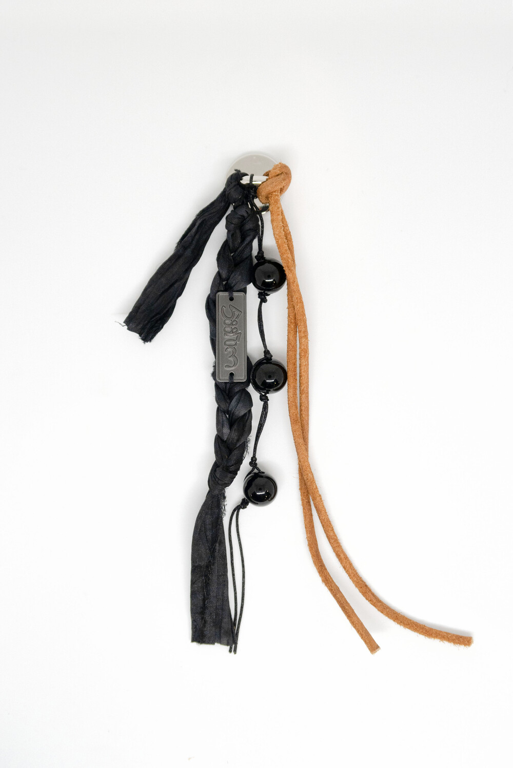 천연 스웨이드 소가죽을 두 갈래로 길게 늘어뜨리고, 손으로 땋은 실크 갈래에 메탈 소재의 로고를 부착하였습니다.