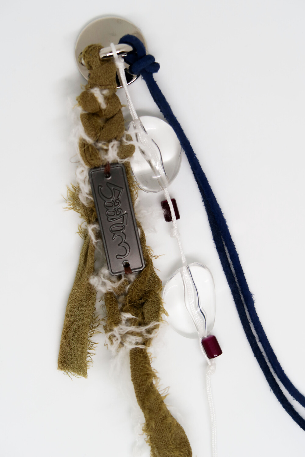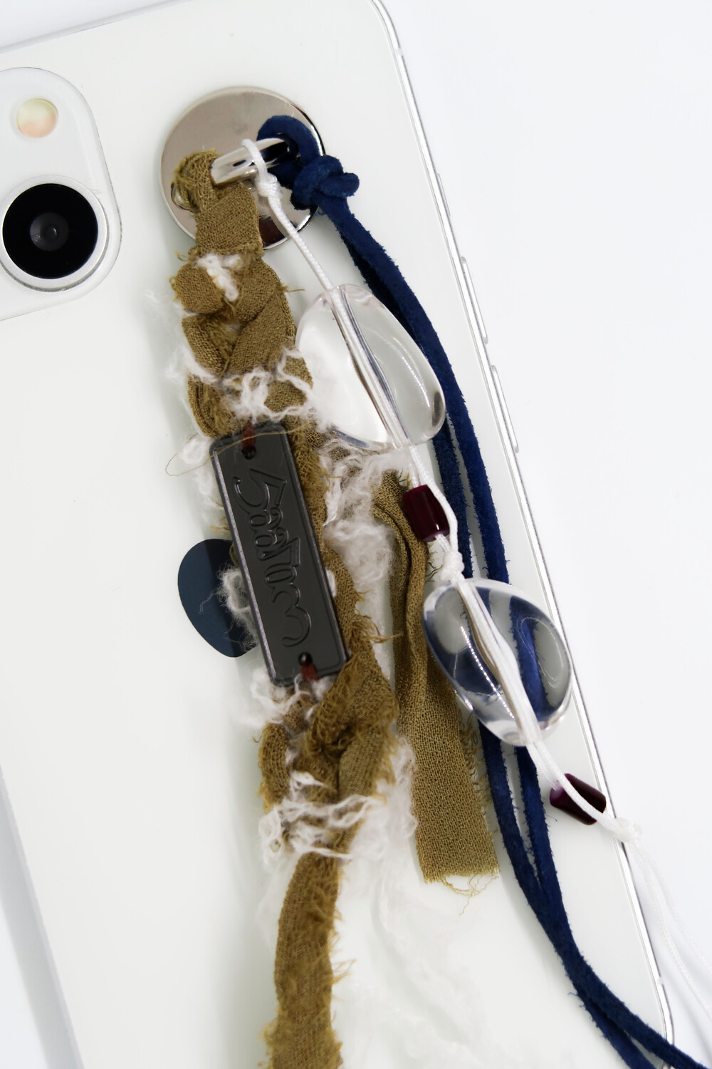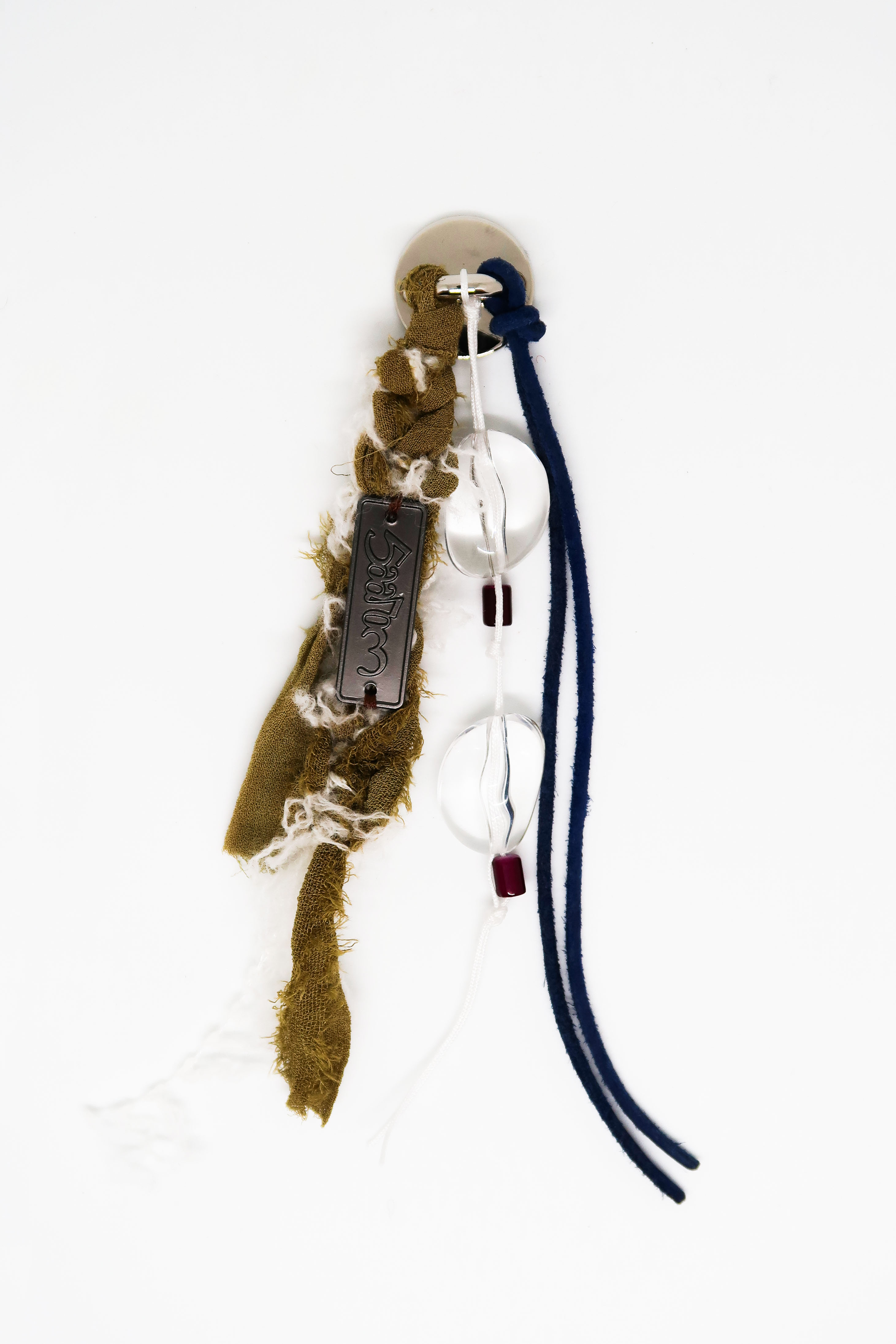 투명한 원석은 새하얀 눈 조각들이 빛을 받아 반짝이는 순간을 표현하며, 카키 컬러의 실크는 겨울 숲의 향을, 푸른 색의 스웨이드 끈은 차갑고 선명한 겨울 하늘을 담았습니다.
