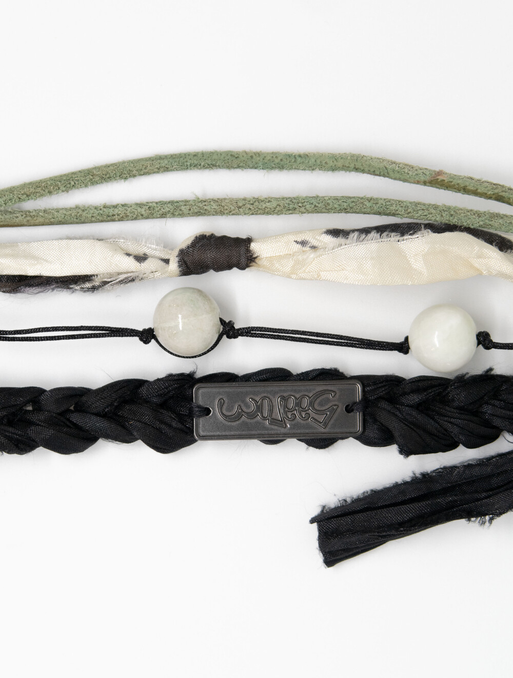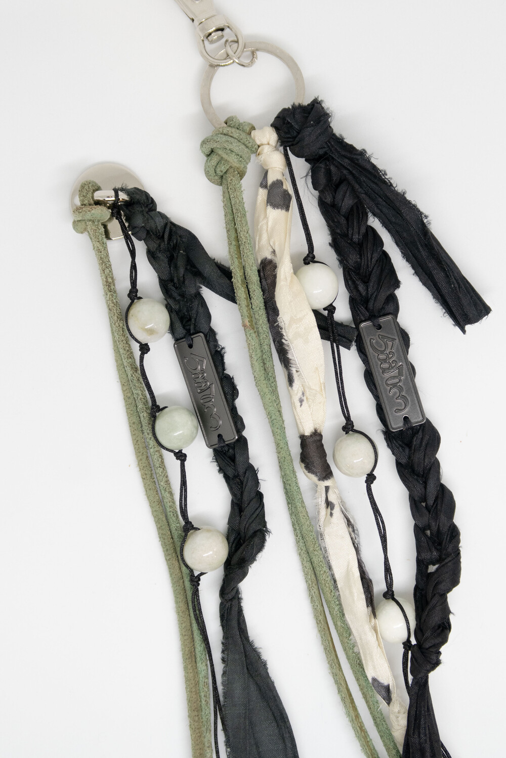 천연 스웨이드 소가죽을 두 갈래로 길게 늘어뜨리고, 손으로 땋은 실크 갈래에 메탈 소재의 로고를 부착하였습니다.